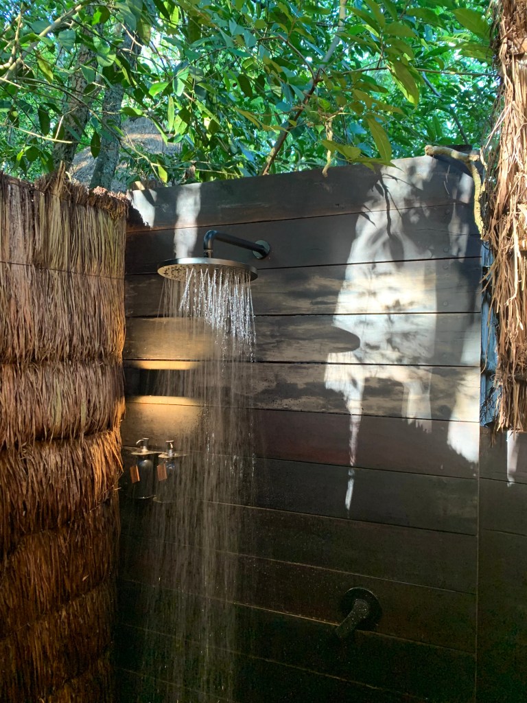 We stayed for four nights at the beautiful Habitas Bacalar and never wanted to leave again. Nestled into the deep jungle stretching onto the banks of the lagoon are A frame tented cabins with thatched roofs and full-sized glass doors offering undisturbed views into the lush greenery. The rooms are comfortable, spacious and furnished in the typical bohemian chic, earthy toned look of the Habitas hotels. Our favorite feature was the outdoor shower: the sounds of the jungle, the sun shining through the thick vegetation, and the homemade honey-infused shower gels and shampoos felt like a wellness journey.